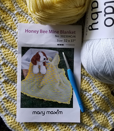 With the preps, there won't be much (if any) crafting today or tomorrow. I did get some done on the baby blanket I'm working on. I have a few rows left to go before I do the edging. This will be another addition to the donation box. This is called the Honey Bee Mine Blanket and was the April 2023 Crochet Kit of the Month from Mary Maxim. As far as I can tell, this pattern is not available. This has been in my rotation since April 2023.